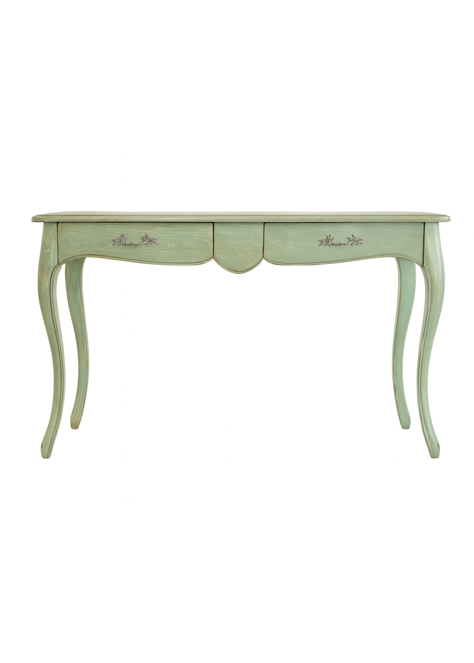 Consola de madera verde con dos cajones.