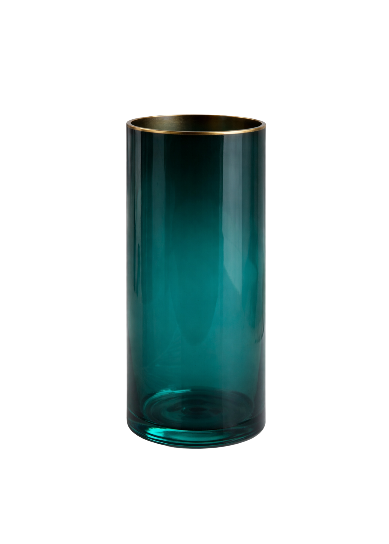Florero de vidrio verde y borde dorado.