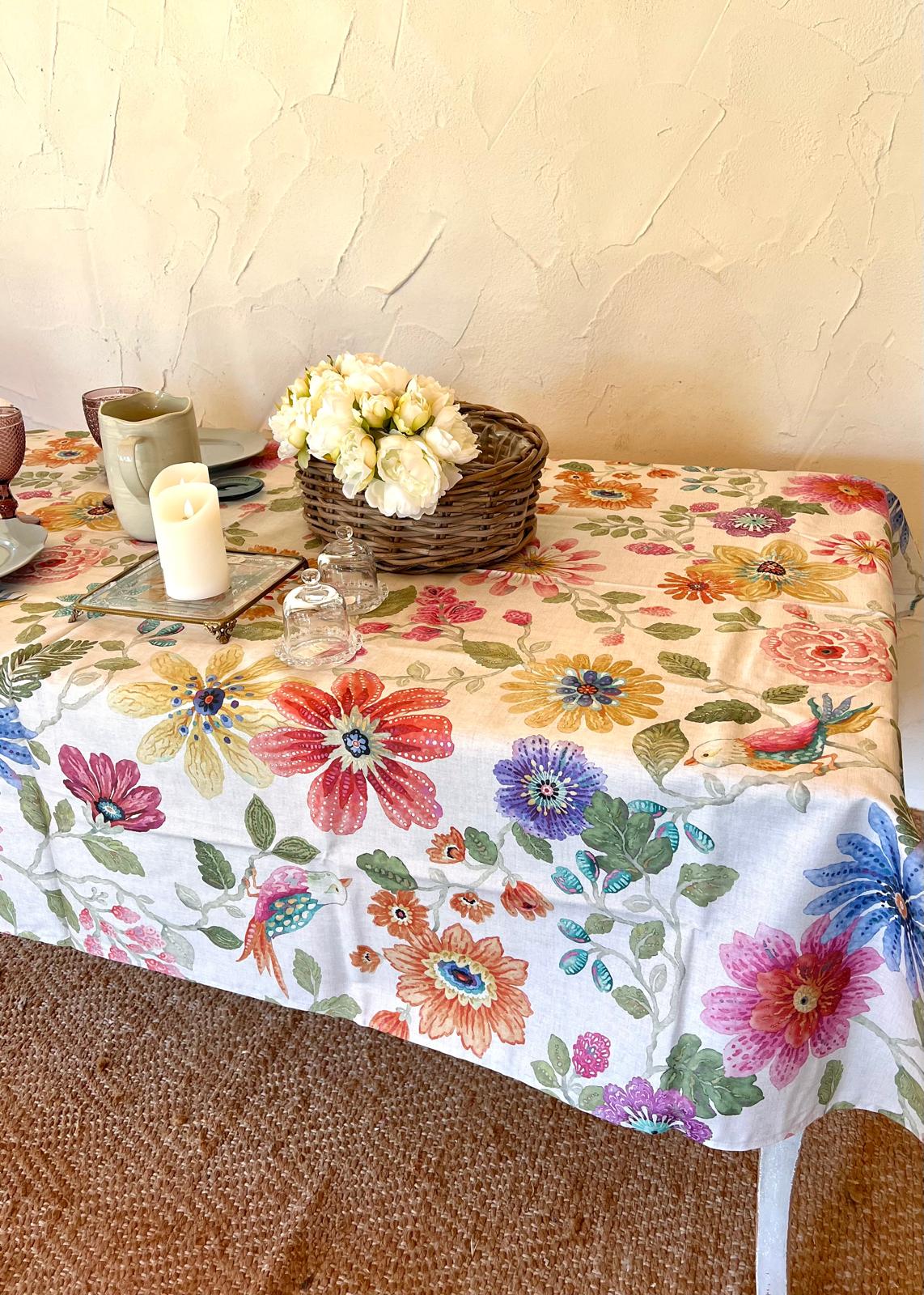 Mantel de flores y pájaros.