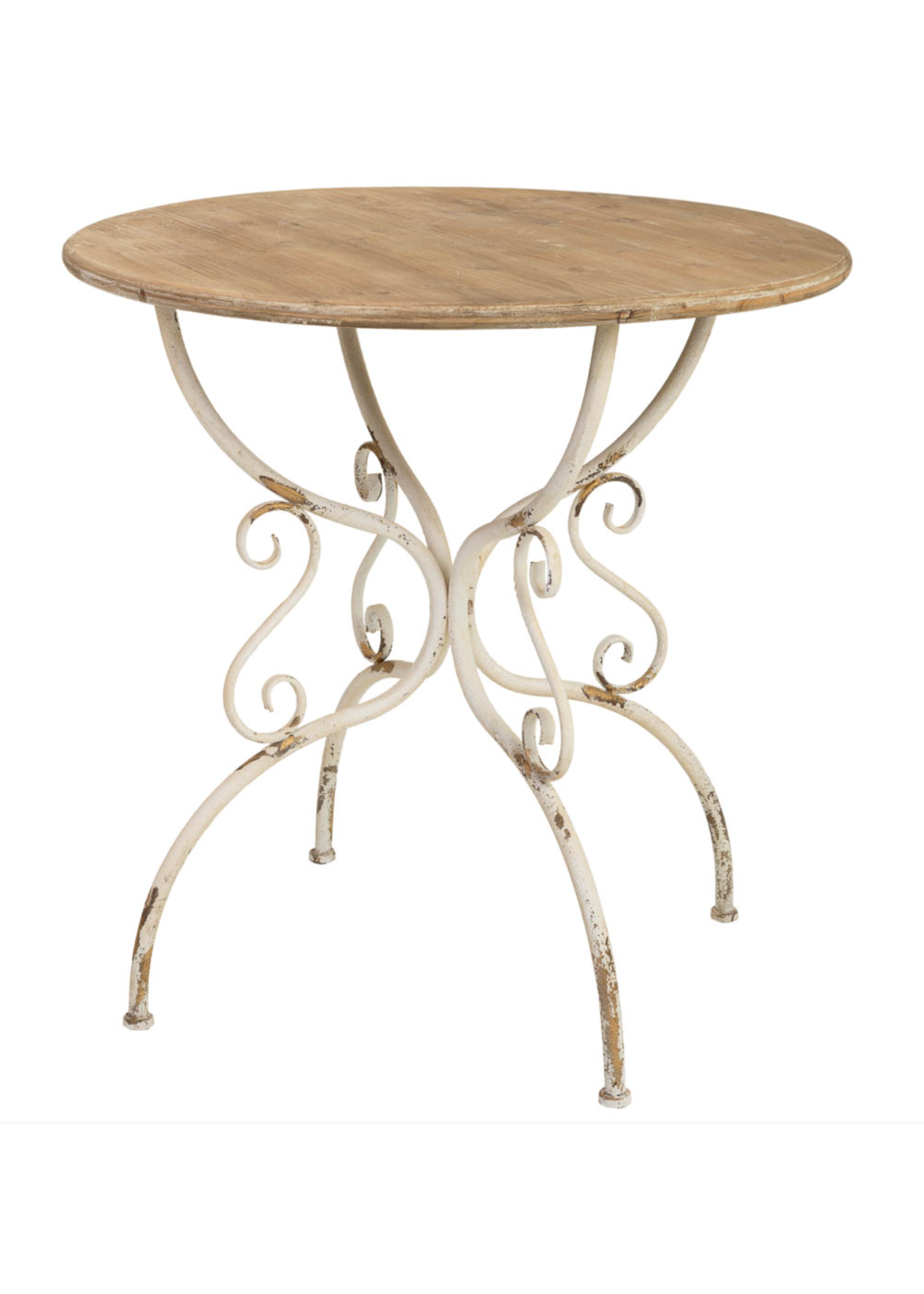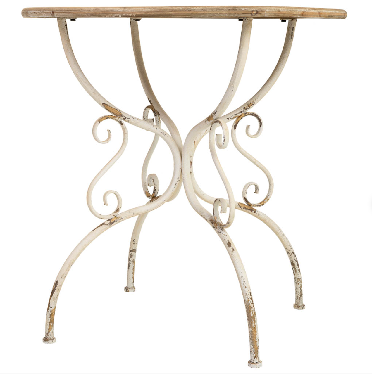 Mesa auxiliar de madera y metal con acabado envejecido.