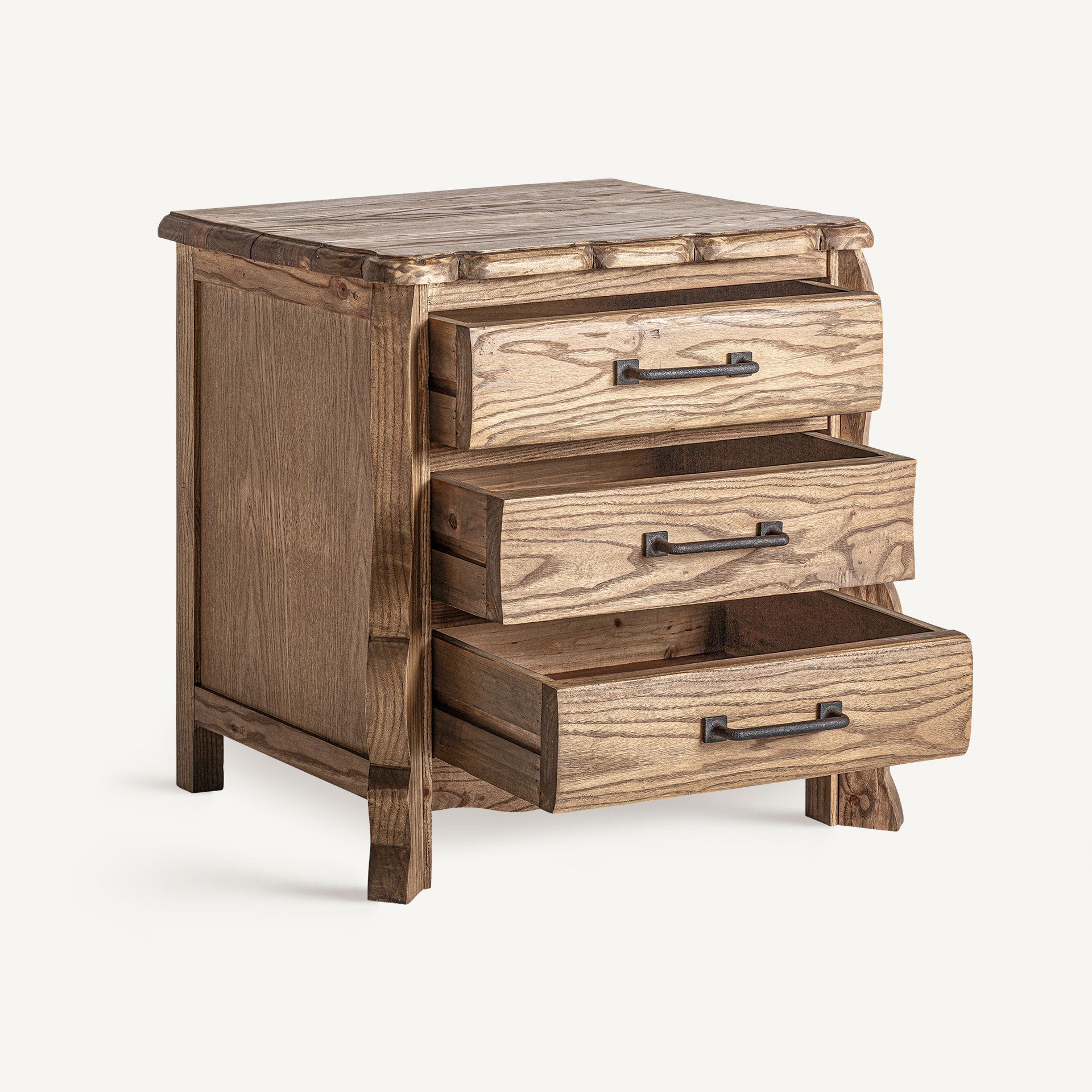 Mesita de noche de madera de olmo acabada en un color natural.