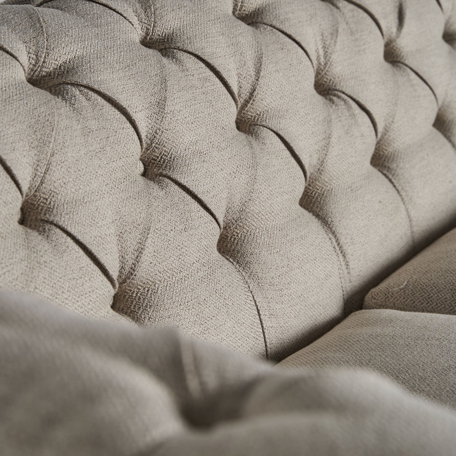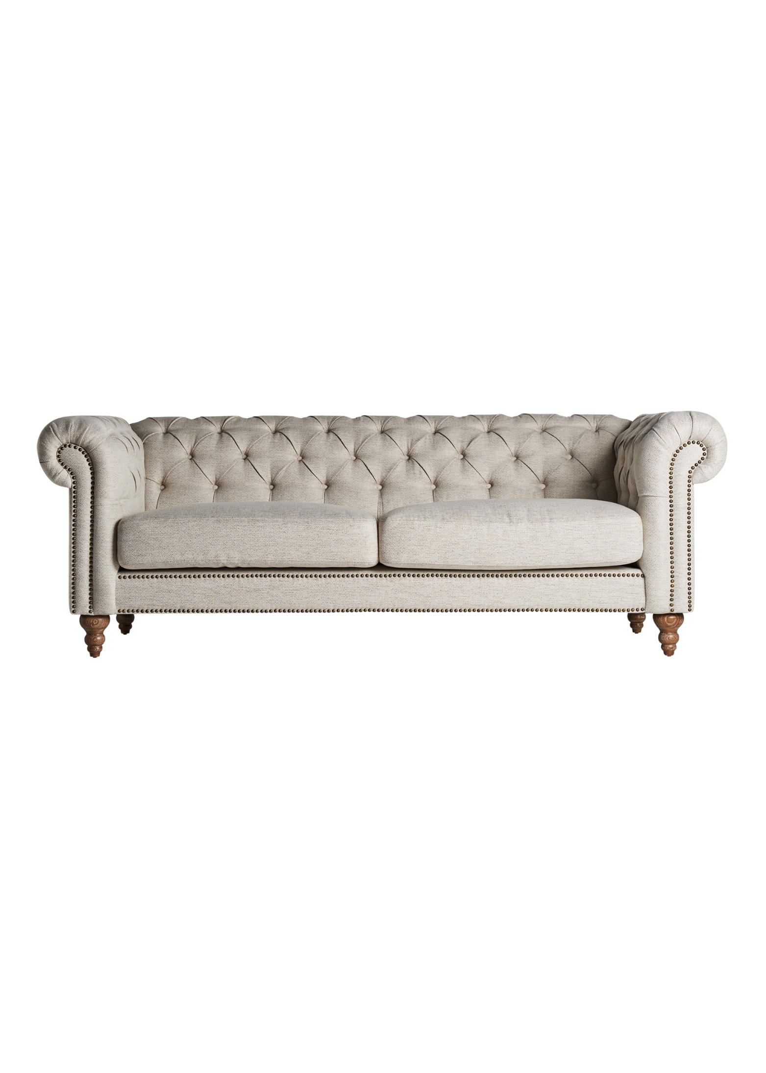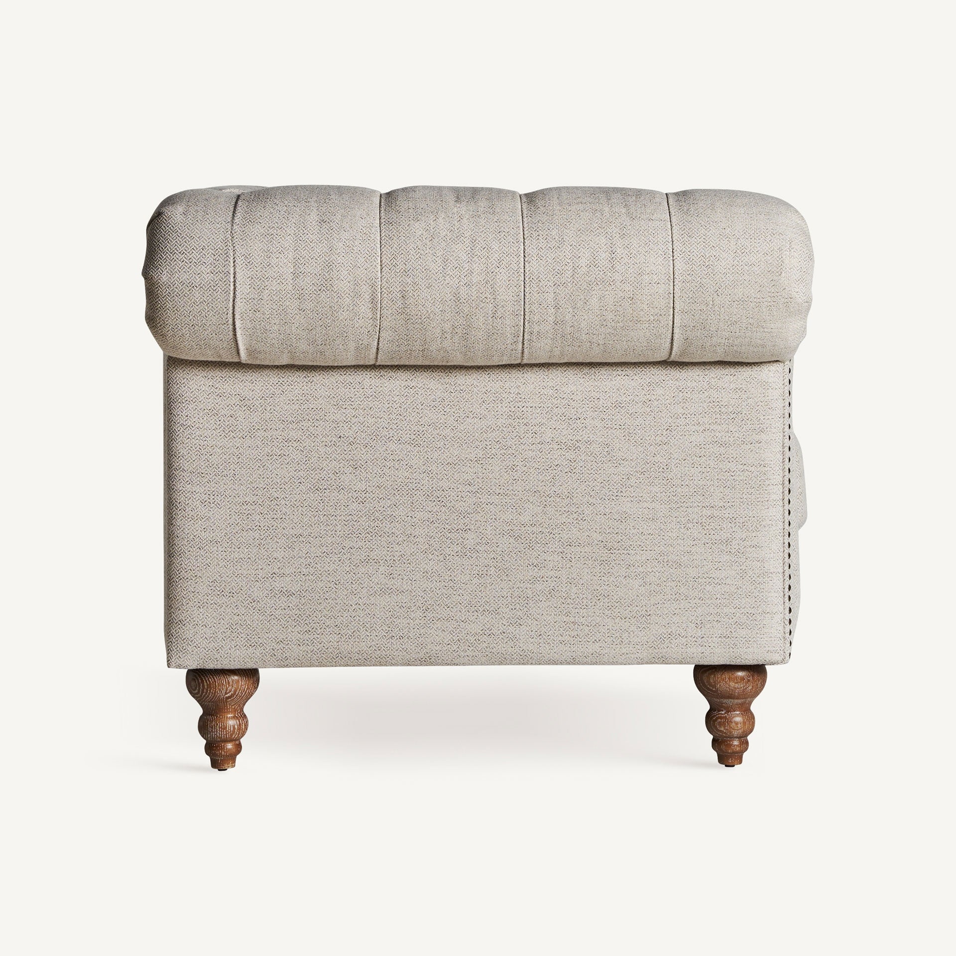 Tapizado en beige y apoyado sobre una estructura de madera de abeto.