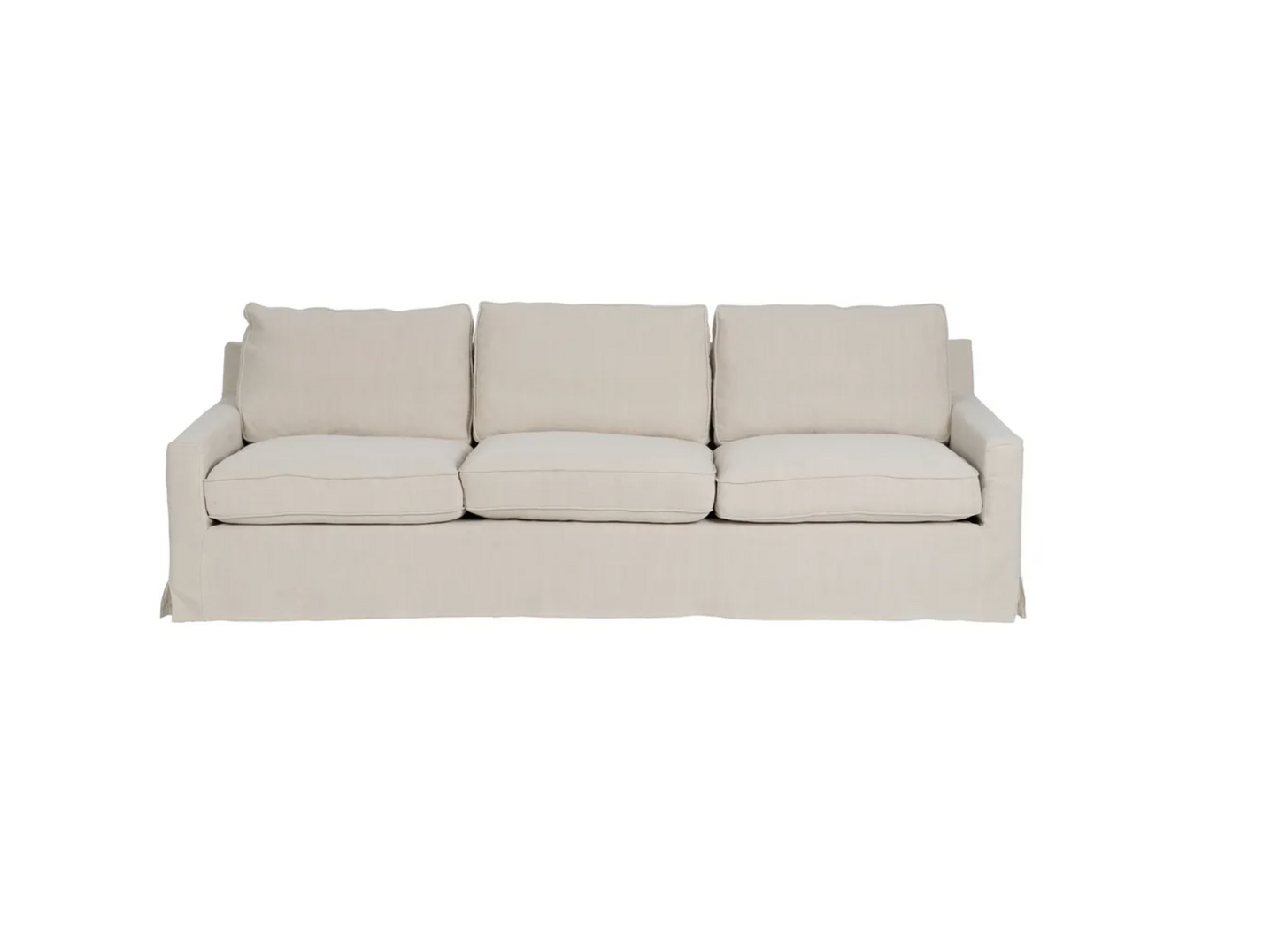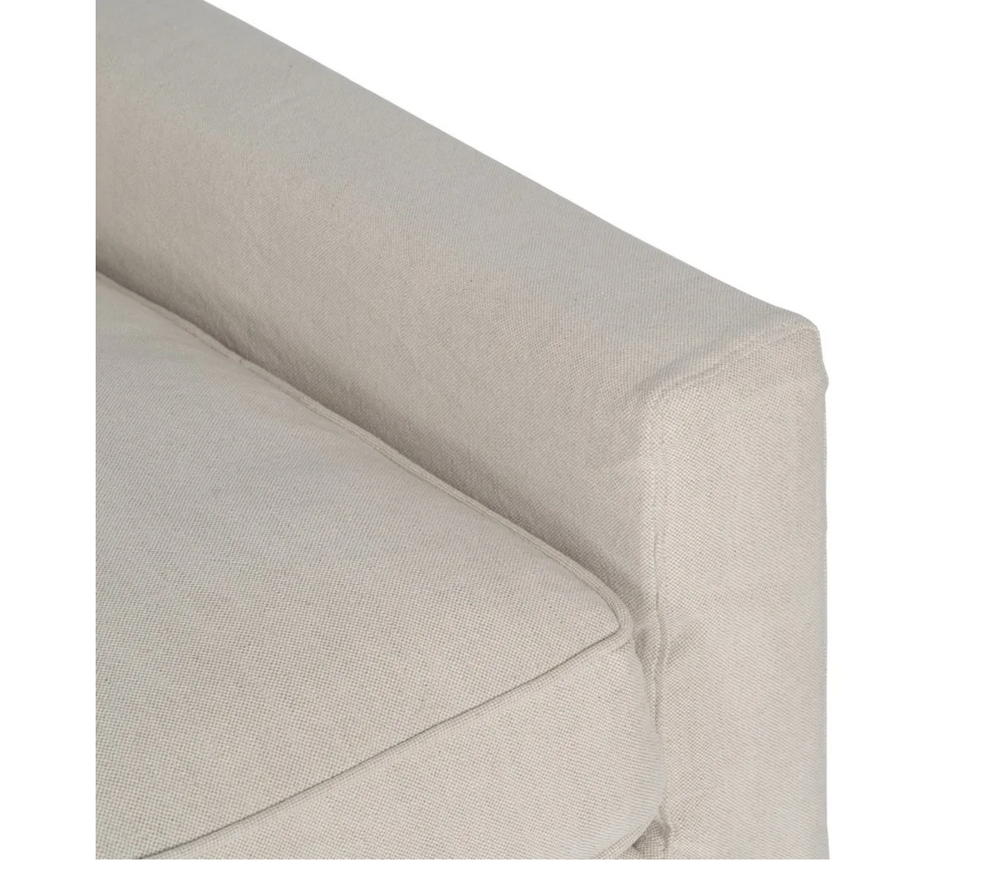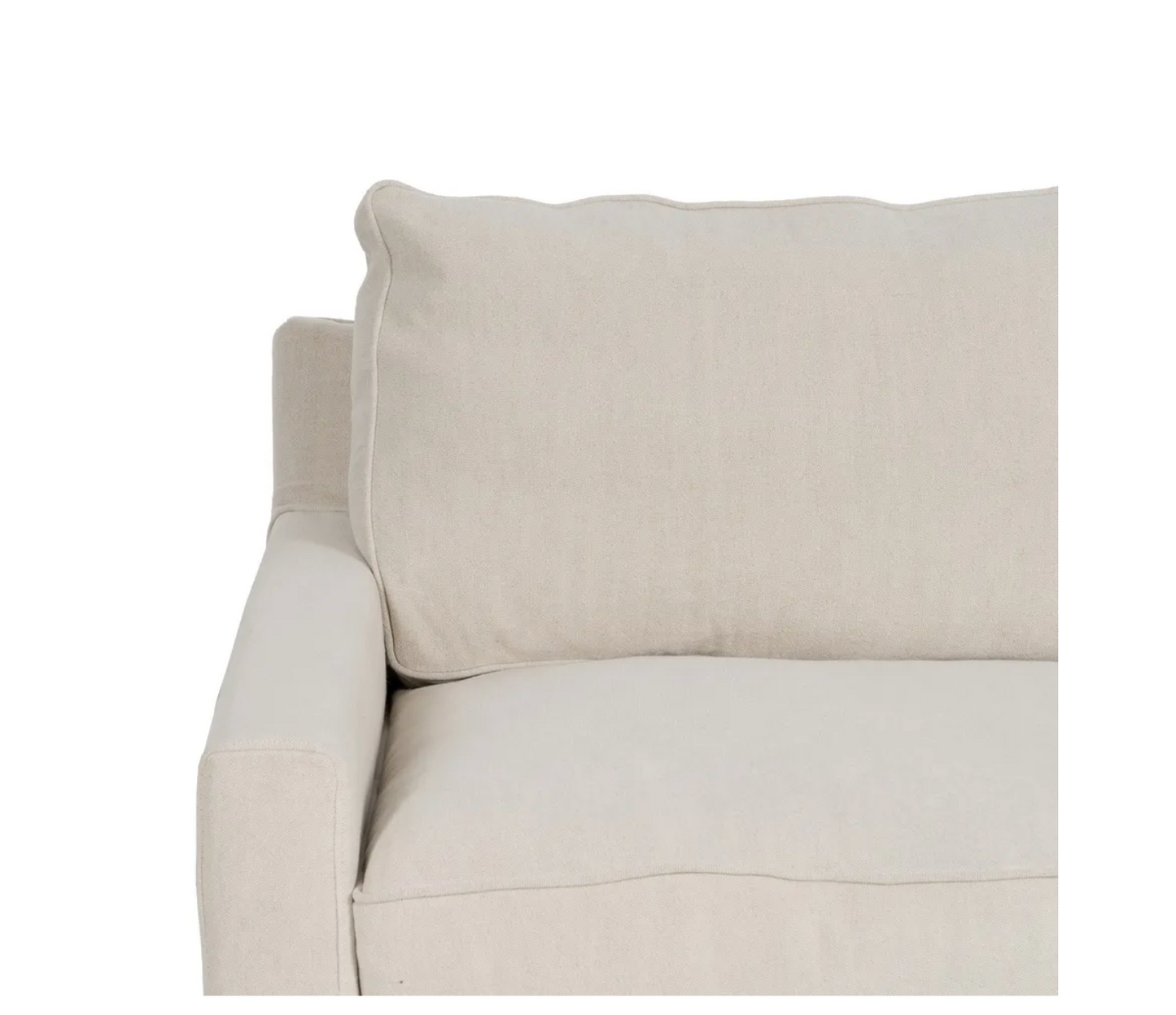 Sofa 4 plazas de madera de pino. El relleno es de foam y pluma y el cierre de los cojines tiene cremallera. Lavado en seco y no usar plancha.